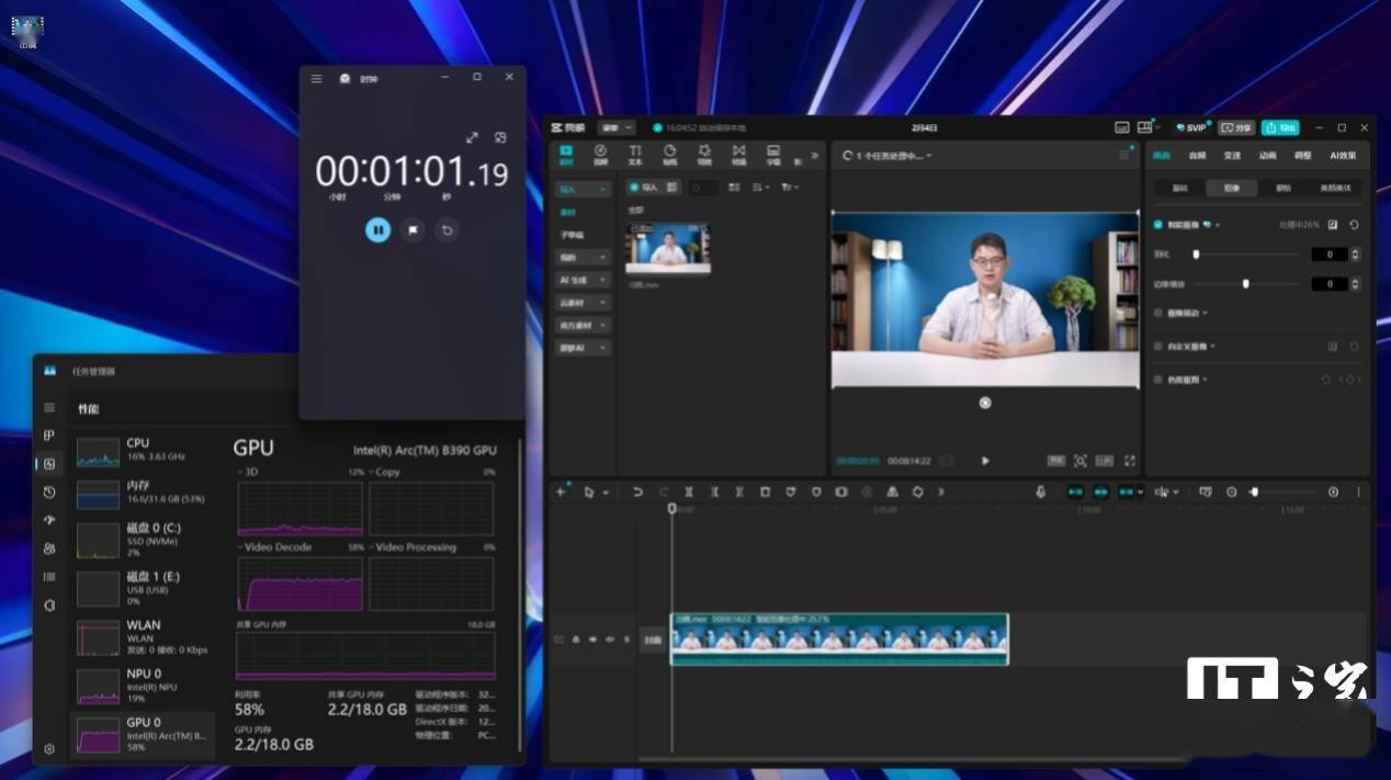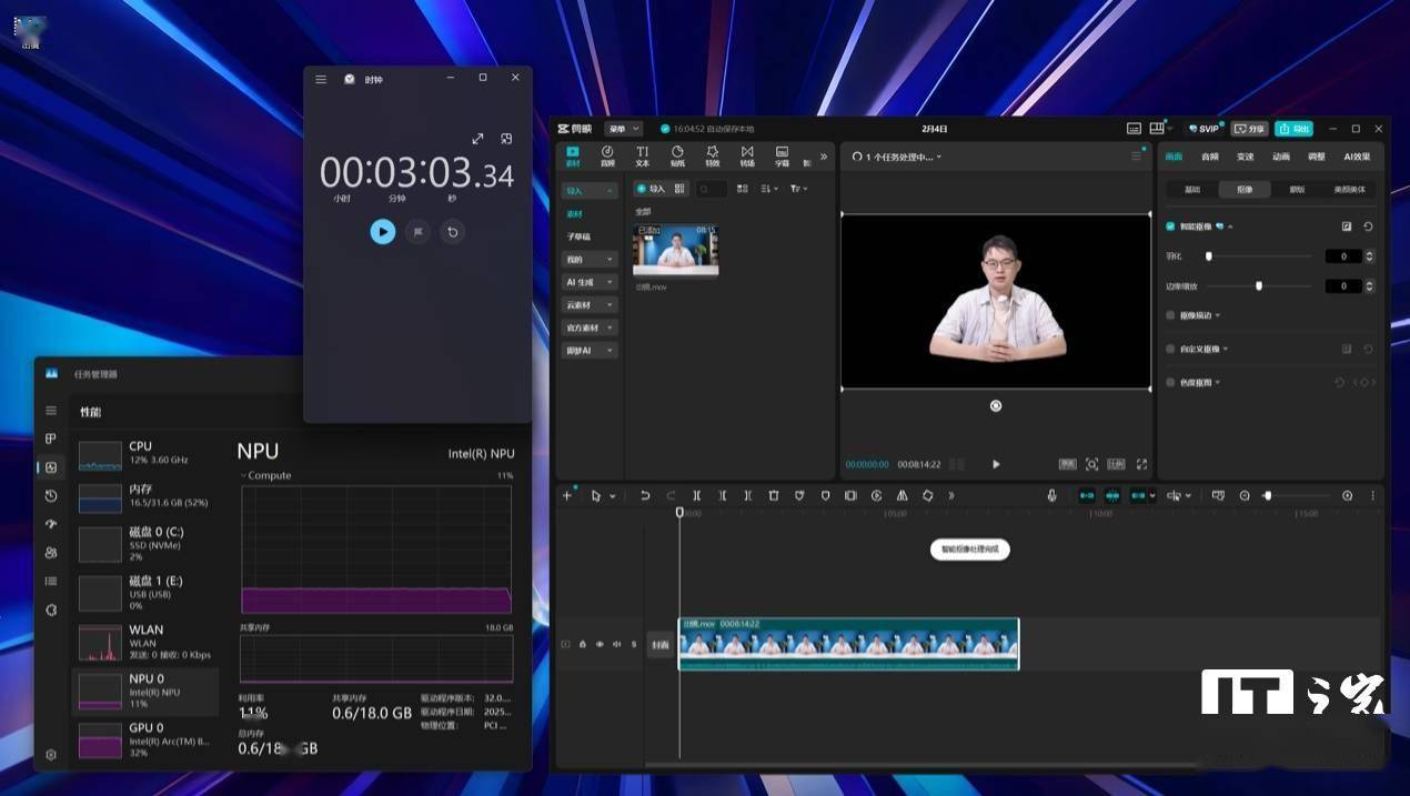 实际应用中,我们测试了剪映 PC 版的 AI 抠像功能,使用一段 4K/30 帧的人物出镜视频进行 AI 抠像处理,此时的 NPU 调用率为 20% 左右,GPU 调用率为 60% 左右。