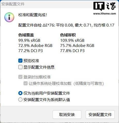 色准方面,我们重点测试了大家比较常用的 sRGB 和 Display P3 两种色彩模式,sRGB 色彩模式的平均 ΔE 为 0.63,最大 ΔE 为 3.25;Display P3 色彩模式下平均 ΔE 为 0.86,最大 ΔE 为 3.64,确实符合官方宣传的出厂校色和 ΔE<1 的色准表现,因此这块屏幕无论是用来日常办公娱乐,还是做一些专业生产力创作,如做图、视频剪辑都能胜任,而且到手即用。