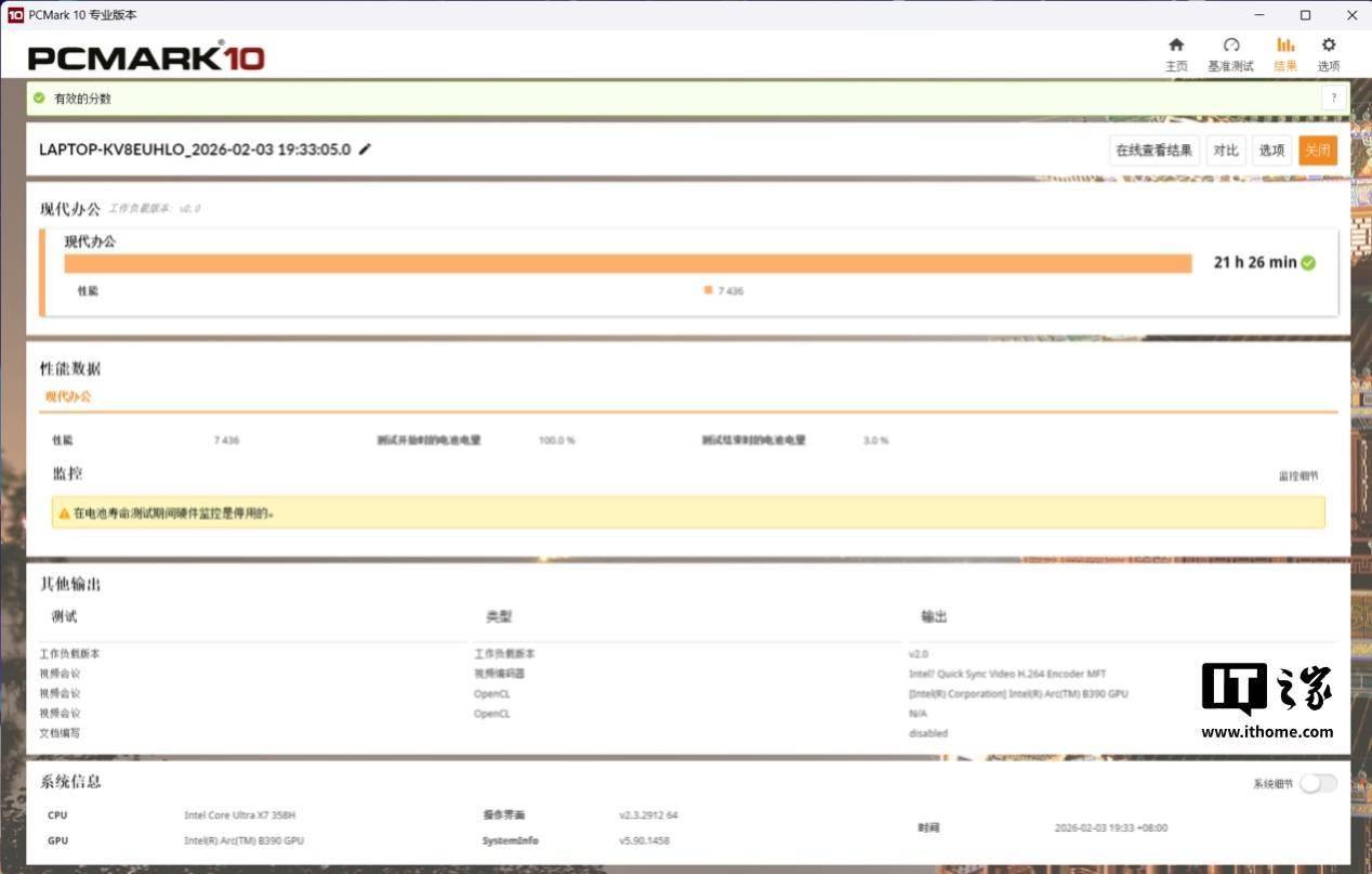 华硕无畏Pro16 2026 酷睿版还搭载了 80Wh 大容量电池,经过实测在固定 150nit 屏幕亮度下,PC Mark 10 现代办公续航测试成绩达到了惊人的 21 小时 26 分,这个成绩意味着什么无需多言,即便将时间砍半也能妥妥用一天。