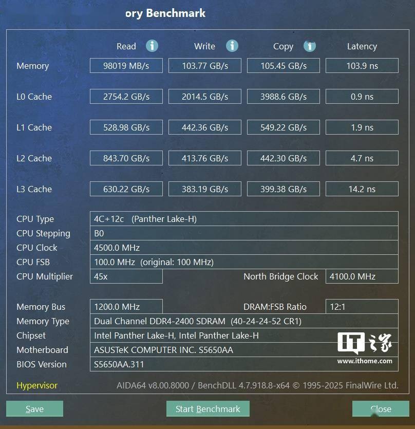 内存方面,其读取速度达到了 98GB/s,写入和拷贝速度均超过了 100GB/s,内存延迟为 103ns。