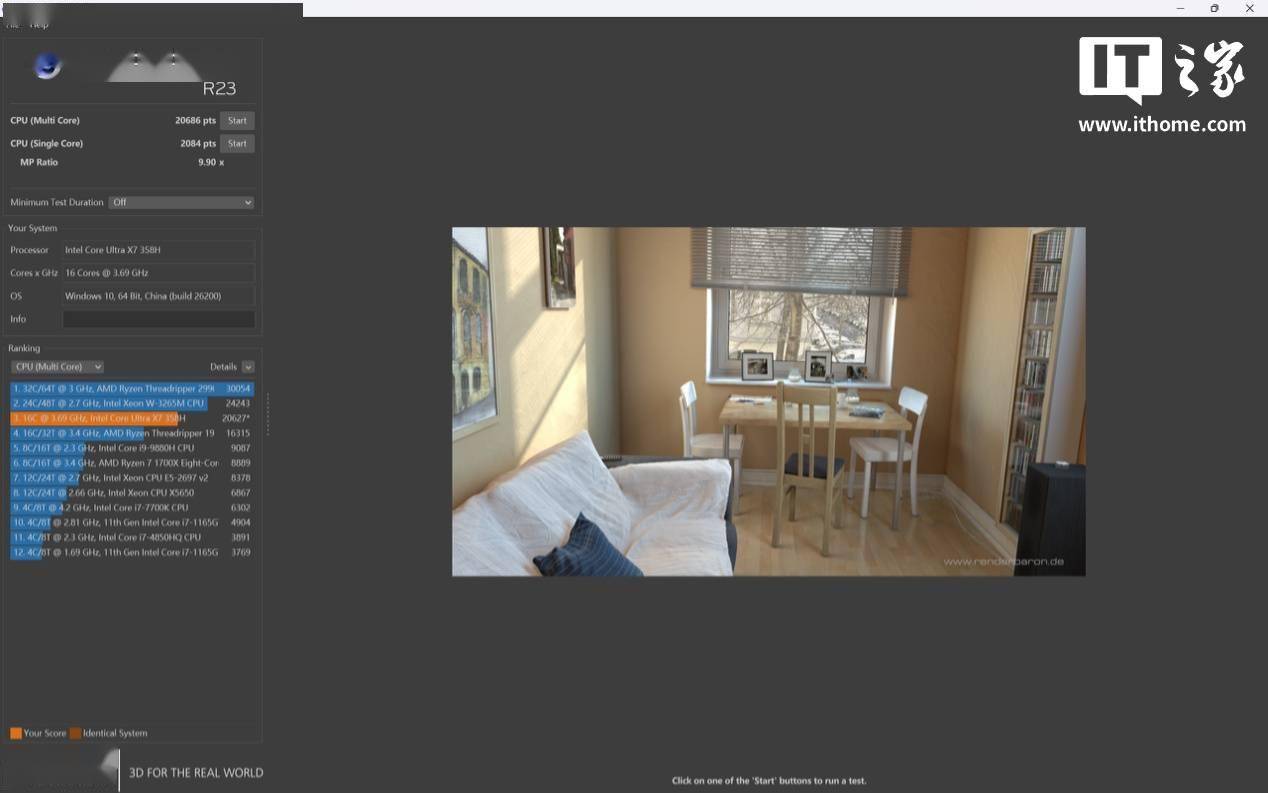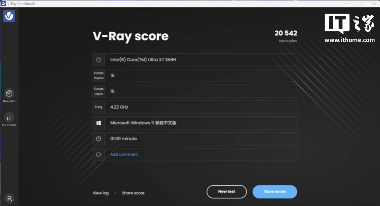 接下来我们接着聊聊生产力,在 V-Ray BenchMark 6 基准测试中,酷睿 Ultra X7 处理器 358H 的 CPU 跑分达到了 20542 分,相比酷睿 Ultra 9 处理器 285H 的 20529 分,直接打成了平手。