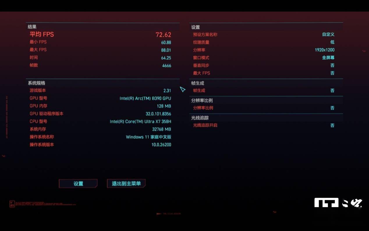 最后我们看下另一款性能杀手《赛博朋克:2077》,它的表现基本就是《黑神话:悟空》的翻版,在 1200P 分辨率 + 低画质预设 + DX12 模式下,运行游戏自带基准测试,游戏平均帧数来到了 72 帧,看起来过了流畅及格线。不过实际游戏中 1% Low 帧还是无法稳定在 60 帧以上,因此游戏体验只能说勉强及格。