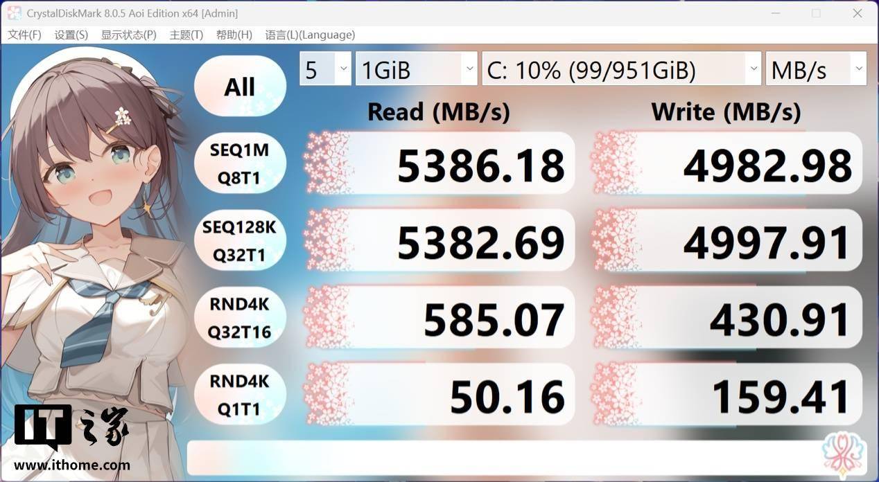 出厂预装的固态硬盘读写性能如图所示,拥有 5000MB/s 的顺序读取和写入速度。