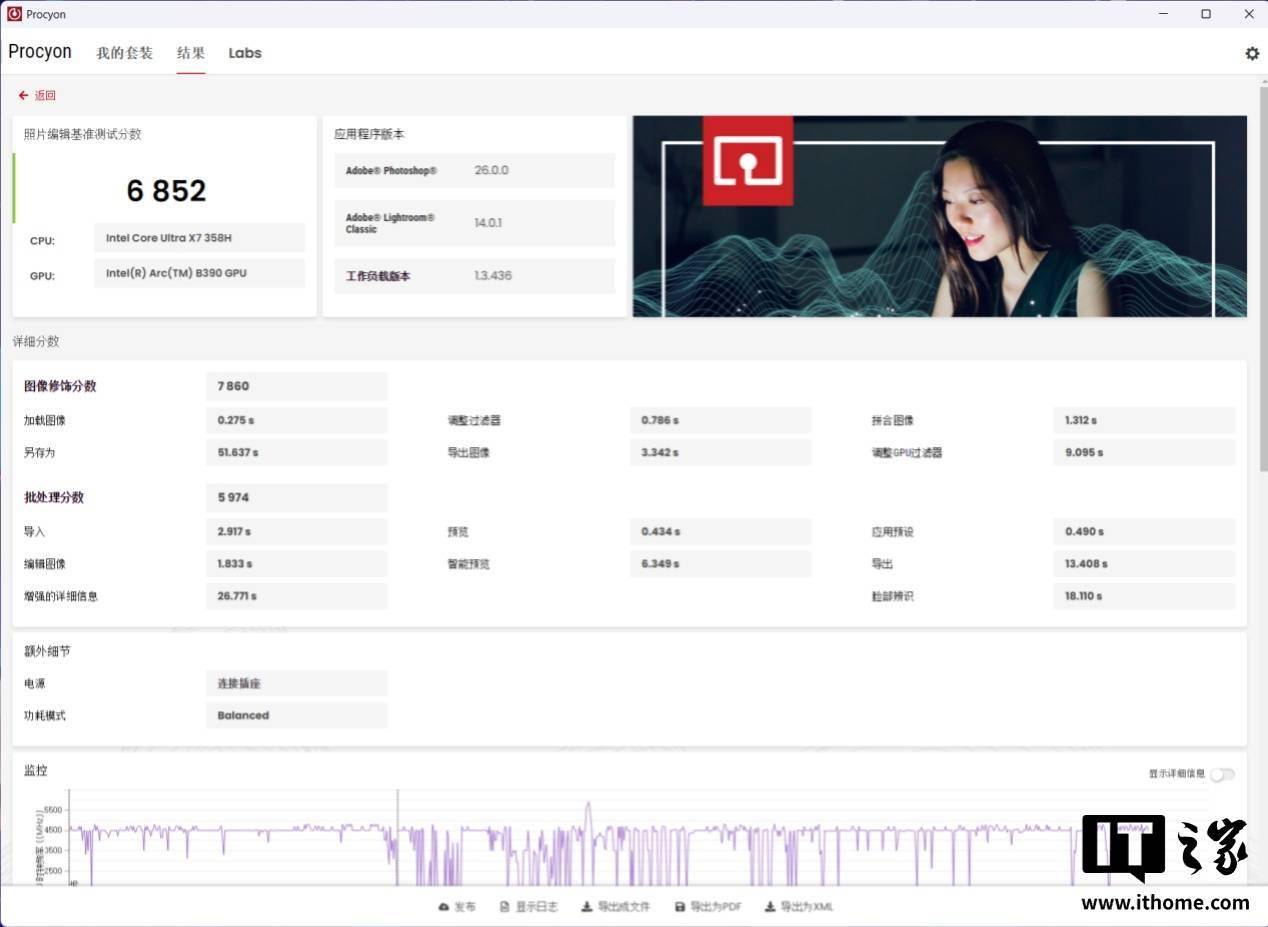 在 UL Procyon 照片编辑基准测试中,酷睿 Ultra X7 处理器 358H 得分为 6852 分,相比酷睿 Ultra 9 处理器 285H 的 5944 分,提升了 15%。