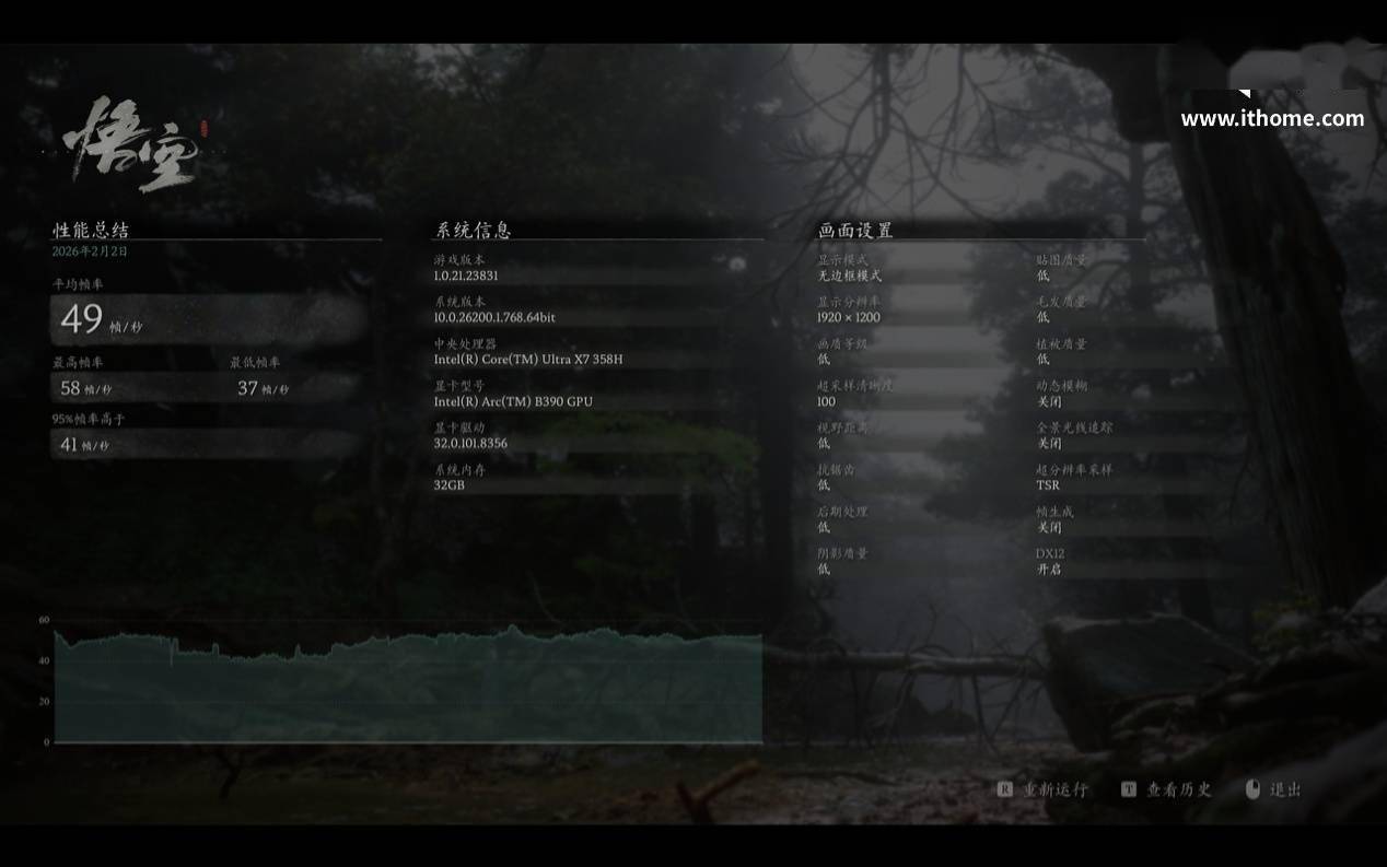 那么我们再看看单机游戏中的表现,直接选择最高难度的《黑神话:悟空》,以 DX12 模式 + 1200P 分辨率 + 低画质 + 100% TSR 超采样清晰度,游戏选项直接“红字警告”。进入游戏内实际跑图测试,游戏平均帧数为 50 帧,性能压力还是非常大的。