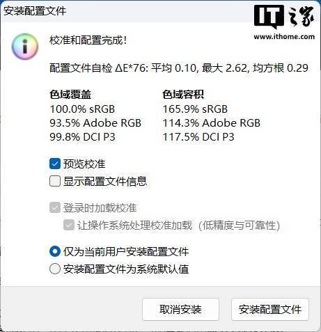 这块屏幕支持三种专业模式切换,默认原生色彩模式和 DCI-P3 模式以及 Display P3 模式同为广色域,实测在原生色彩模式下 sRGB 色域容积达到了 165%,Adobe RGB 和 DCI P3 色域容积均达到了 110% 以上,而色域覆盖上 sRGB 色域为标准 100%,DCI-P3 色域覆盖也有 99.8%。