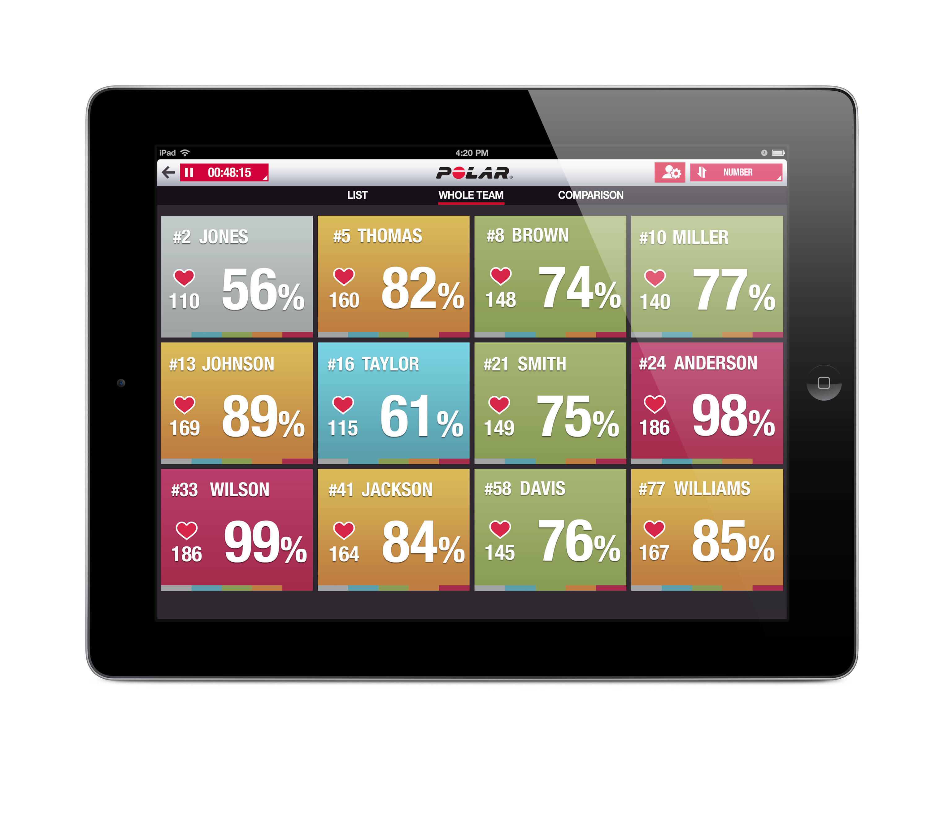 - 实时全员监控:平板显示每位队员头像、即时心率、心率区、平均心率、能量消耗,一眼识别谁已疲劳、谁还有余力。