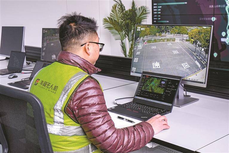 在莲花山公园散步,渴了想喝杯咖啡,手机下单后十来分钟,一架无人机嗡嗡地降落在你面前的空地上,一杯热饮稳稳送到你手上。在深圳,你收到的快递、点的外卖,可能有一程是“飞”过来的。而这些飞行任务的背后,有一群人在盯着每一架飞机的实时数据,他们是无人机机长。