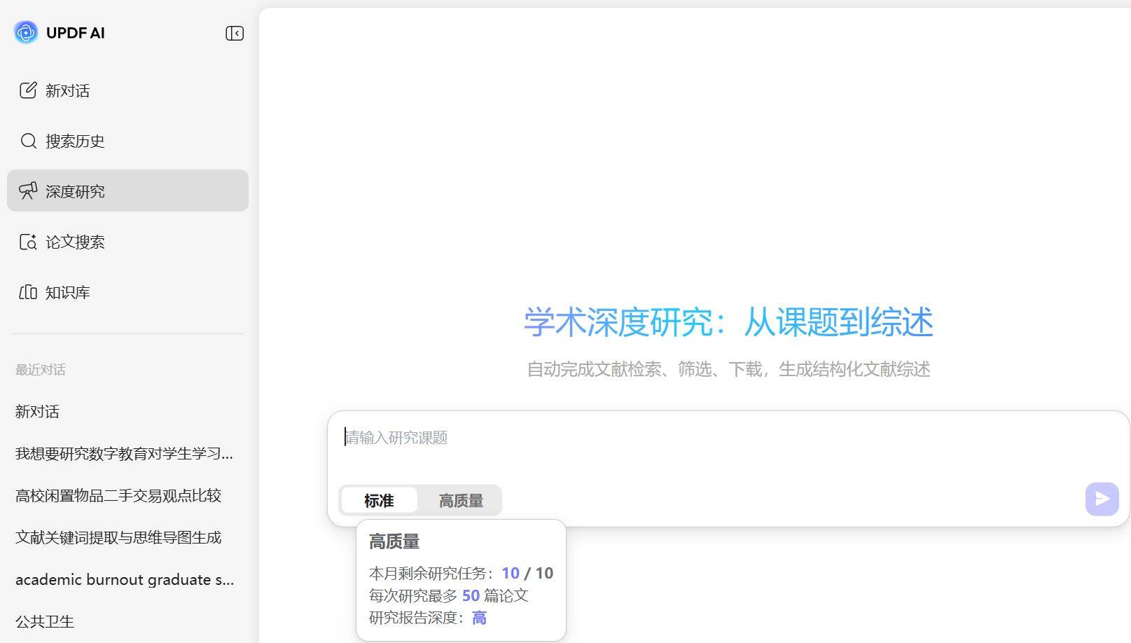 当需要整理研究结构时,还可以使用 深度研究功能,快速生成: