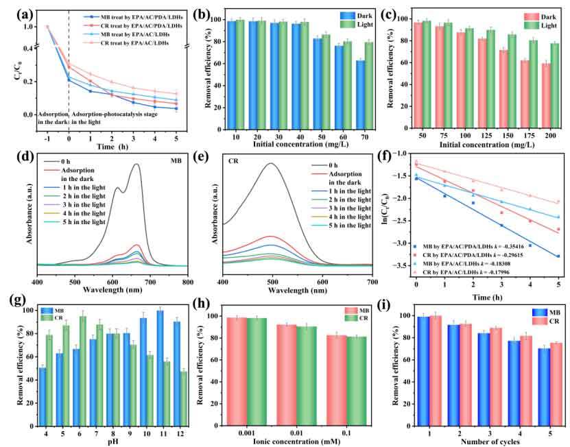 图5:LDHs/PDA/AC/EPA复合膜在不同条件下的吸附性能。