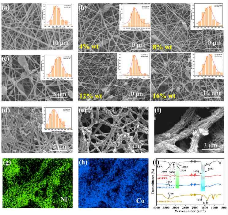 如图2所示,AC均匀嵌入纤维网络中且使得纤维直径变得更细,PDA修饰后纤维表面更为粗糙,有利于后续LDHs在纤维表面均匀稳定生长。局部放大图进一步显示,LDHs纳米片与纤维基底结合紧密,无显著脱落或团聚现象,表明室温合成法可以有效实现LDHs的负载。元素分布结果进一步证明了各功能组分在纤维膜中的均匀分布。