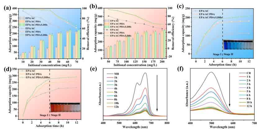 如图4所示,可以看到,LDHs/PDA/AC/EPA复合膜对两种不同电性的染料——亚甲蓝(MB)和刚果红(CR)均表现出快速且高效的吸附能力,并在较短时间内达到吸附平衡。
