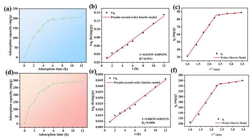 如图5和图6所示,吸附过程与准二级动力学模型及Langmuir等温模型具有良好拟合度,说明染料分子在膜表面发生了多位点协同吸附,进一步验证了复合膜表面活性位点的有效利用。为阐明超越动力学拟合范围的质量传递机制,应用了颗粒内扩散模型,这些曲线呈现出多线性特征,表明吸附过程是通过多个步骤进行的,而不是由单一的扩散过程所主导。初始区域归因于外部表面的快速吸收,随后是染料分子迁移进入多孔纤维网络时的较慢颗粒内扩散阶段。