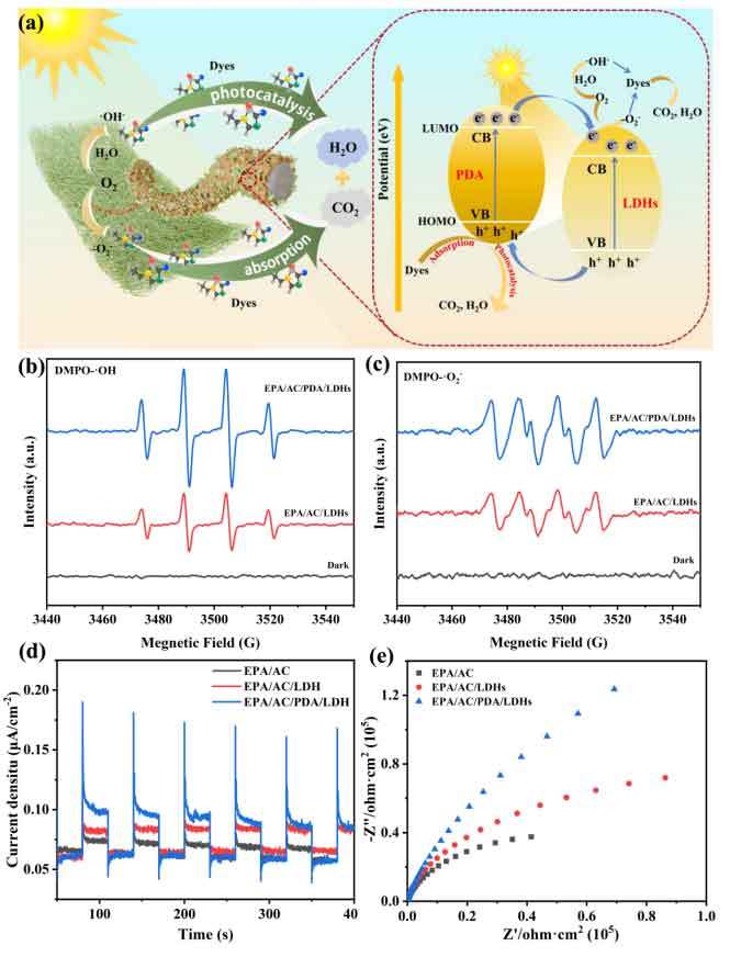 图8给出了吸附-光催化协同处理染料的机理示意图,并进行了ESR、光电流响应及EIS测试,对该协同效果进行了佐证。