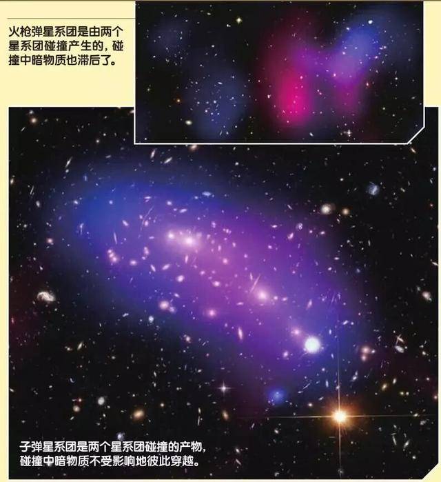 在这些星系里,可见的恒星只占星系总质量的大约2%,另外12%的物质是放射出X射线的温热气体,剩余86%是不可见的暗物质。因为星系团里星系是如此少,如此稀疏,所以两个星系团碰撞时,这些星系不受阻碍地穿越了过去。而热气体则因彼此碰撞受到阻碍,要比星系滞后。