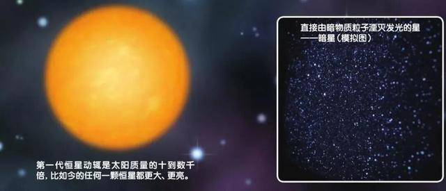 不过,如果有关恒星形成的一个新理论是正确的话,那么在靠核聚变反应发光的第一代恒星形成之前,或许还存在另一类更加原始的“恒星”,它们不是通过核聚变发光,而是靠暗物质粒子湮灭发光的。这种天体严格来说还算不上是恒星,但因为它是恒星的前生,所以叫“原恒星”,或者干脆叫“暗星”。