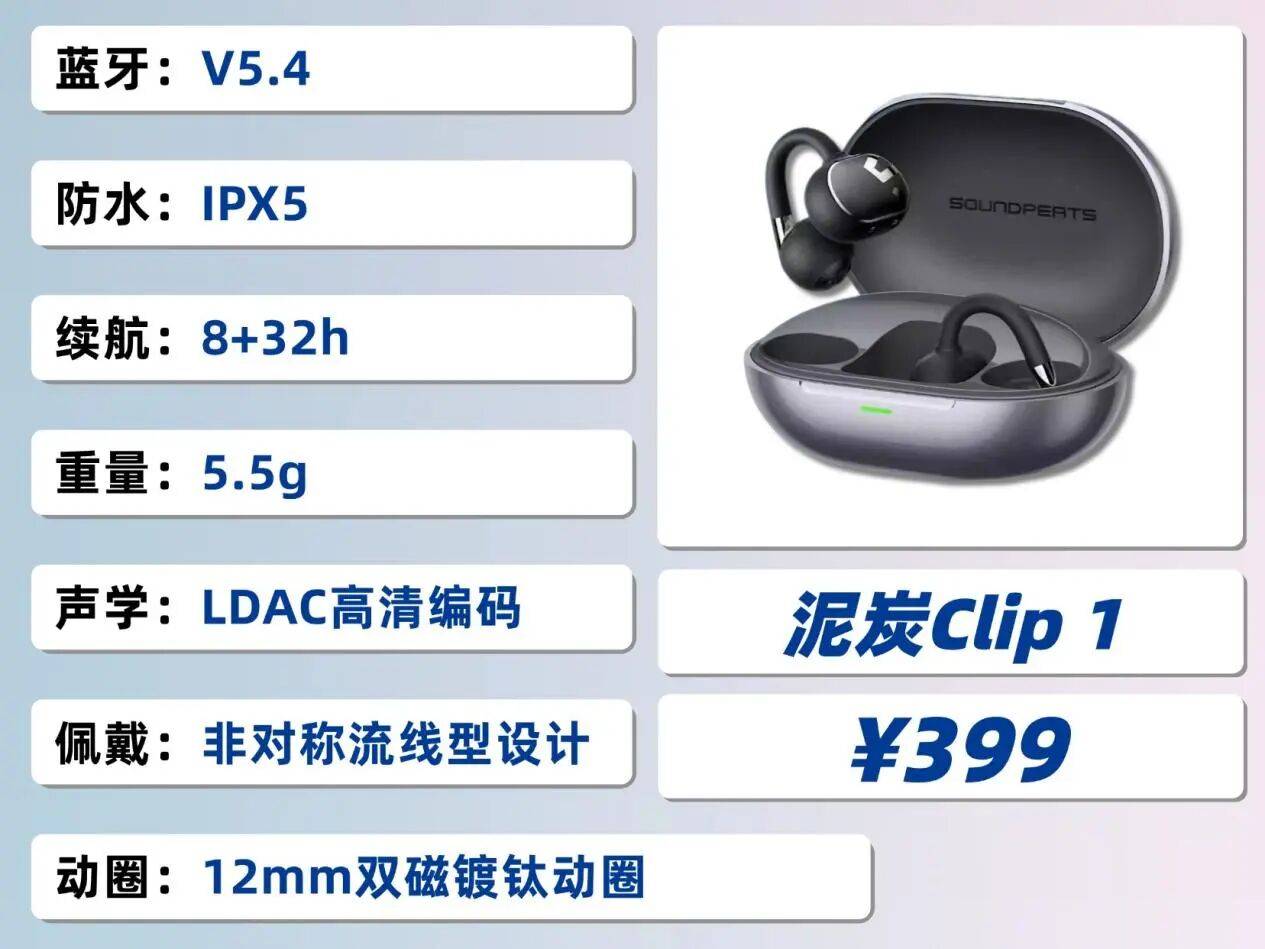 泥炭 Clip1 运用仿生弧度人体工学设计,单耳轻至 5.5g,搭配柔软亲肤的硅胶耳垫,重量分配更合理。C 形钛合金支架韧性适中,能够适配不同耳型,日常办公、外出通勤都能佩戴稳固。耳机搭载 12mm 双磁镀钛振膜动圈单元,结合品牌自研的动态均衡调音算法,三频衔接顺滑,中高频解析力表现优秀。同时支持 LDAC 高清编码与杜比音效,音乐细节还原充足,声场宽广且立体感强。