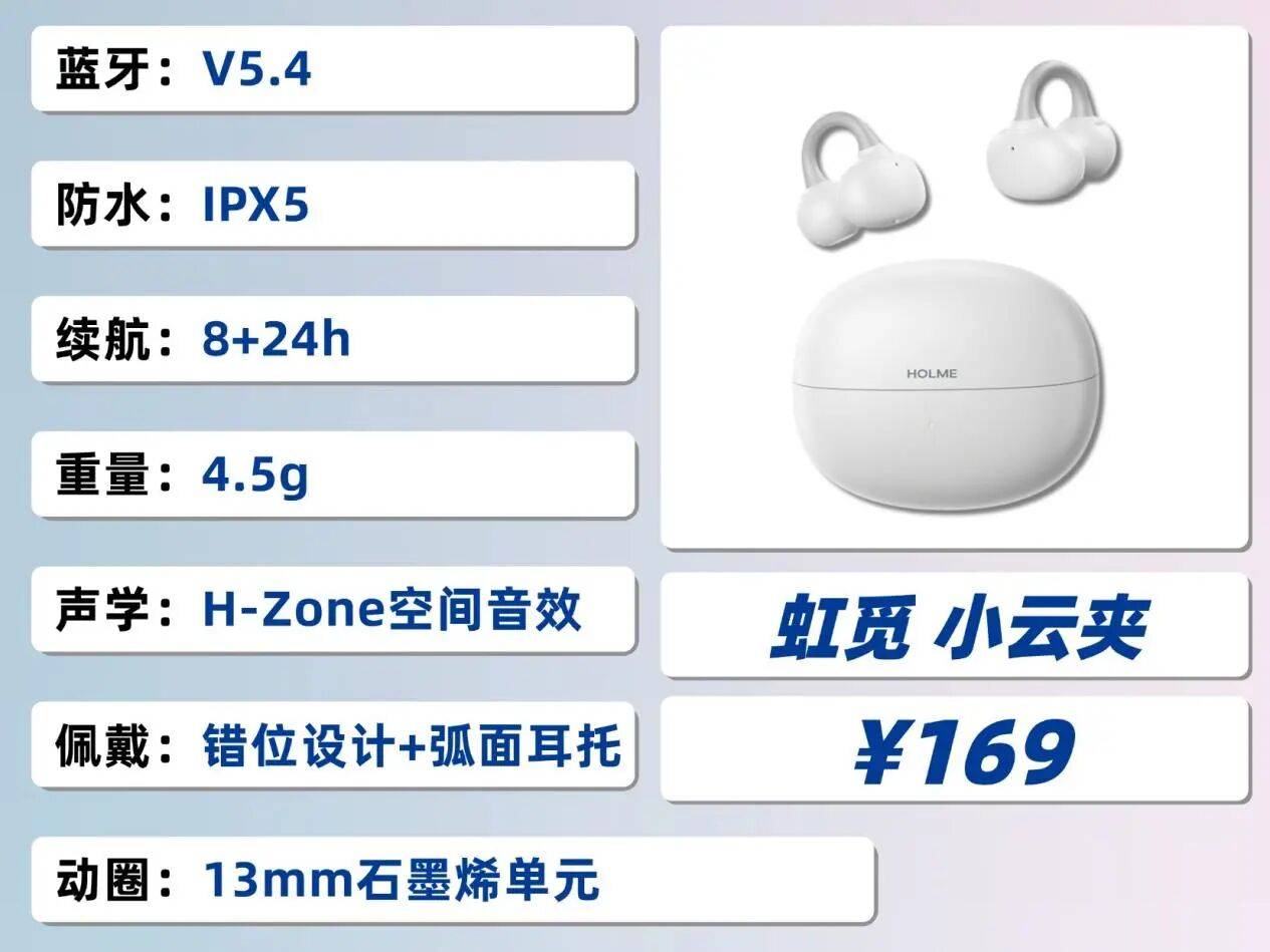 虹觅小云夹在佩戴上玩出了新花样,2.5mm 前高后低的错位设计贴合耳道自然结构,戴上去稳稳当当不晃动;电池仓的 12° 弧面耳托还能托住耳背分散压力,久戴无负担。更绝的是它 4.5g 的单只重量,轻到几乎让人忘记佩戴,连续三四个小时也毫无夹耳感。音质上,石墨烯动圈单元凭借优秀的形变能力,让声音细节清晰可辨,听感真实细腻。自研防漏音模式一键解决外放尴尬,地铁、办公室使用都很合适;HBC 智能双联功能还能让一副耳机拆成两幅单独用。论佩戴舒适度、音质表现和实用性能,它都是百元档耳夹式耳机里的天花板!