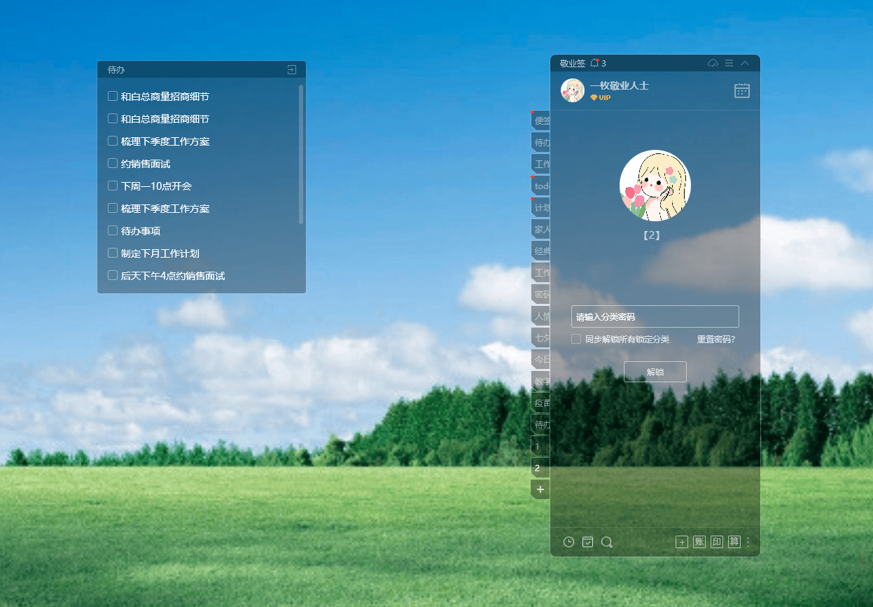 更实用的是,单个分类还能“云游”在桌面上,以独立小组件的形式展示,重点待办时刻摆在眼前,时刻提醒自己。涉及薪资、私密事务等敏感内容的分类,还能单独上锁加密,全方位保护隐私,使用起来更安心,细节设计完全戳中上班族需求。