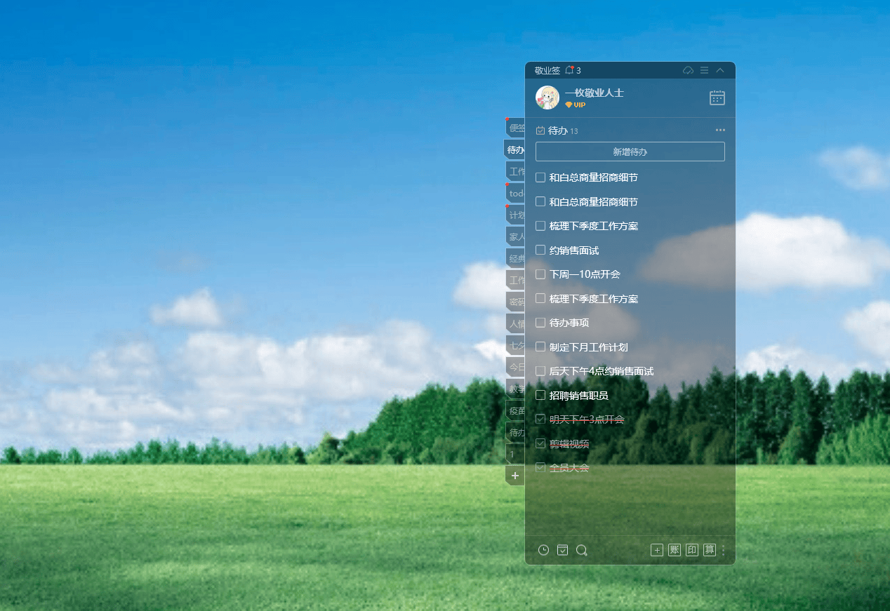 敬业签没有冗余的设计,整体界面清晰简约,没有烦人的广告弹窗,打开就能快速上手,操作零难度。尤其是电脑端体验格外贴心,支持背景透明化设置,还能直接嵌入电脑桌面,不用反复点开软件,桌面就能查看所有待办,随时编辑、随时核对,不遮挡办公窗口,完全融入日常办公场景。
