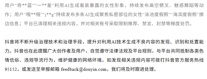 零容忍!抖音重拳严打AI生成色情低俗类违规内容,已处置4.2万条内容、1.4万个账号(抖音重启什么意思)