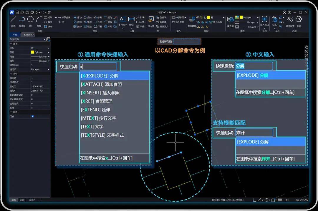 现场紧急变更,直接在鸿鹄CAD中输入中文“延伸”或口语化命令如“炸开”,即可调启功能,省去记忆繁多英文命令(如“EXTEND”)的烦恼 。