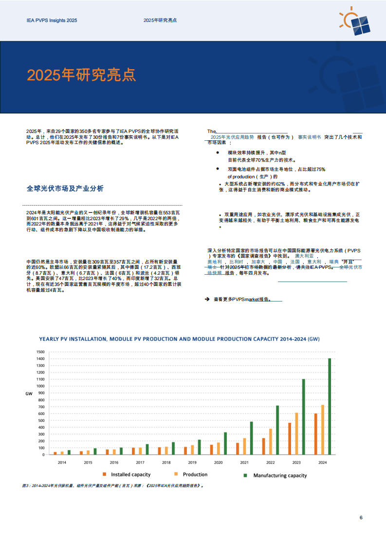 《IEA PVPS Insights 2025》聚焦全球光伏产业发展与技术创新,由国际能源署光伏电力系统项目(IEA PVPS)发布,汇集了29个国家350余名专家的研究成果,2025年发布30份报告和7份事实说明书,展现了光伏在能源转型中的核心地位与多元发展趋势。