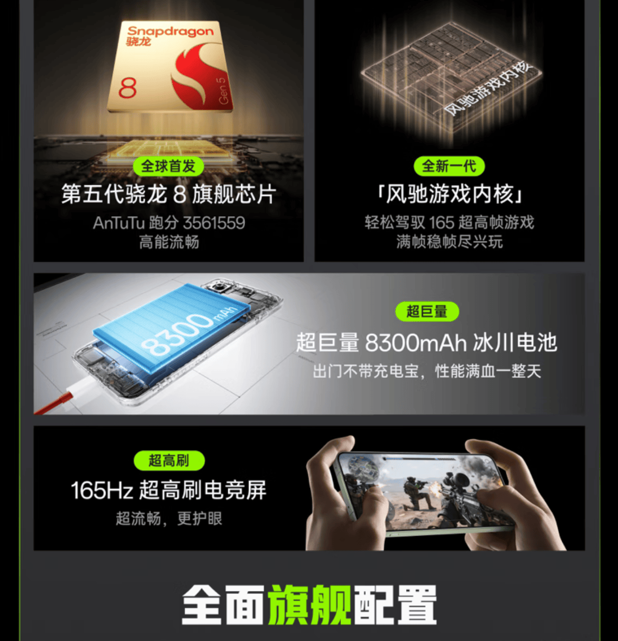 咱盘一盘这个价位你能买到啥:骁龙 8 Gen5、165Hz 高刷直屏、8300mAh 巨无霸电池、100W 快充、5000 万像素主摄。