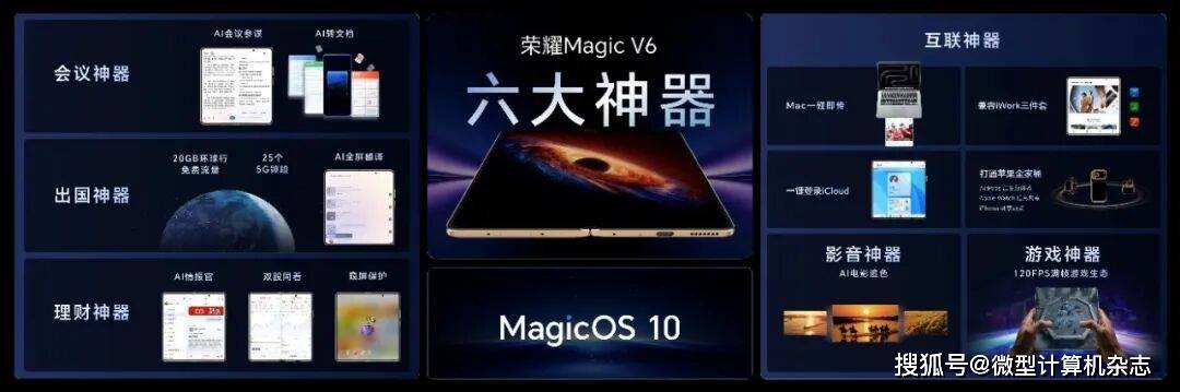 如果说硬件实力决定折叠屏的性能边界,那么AI和生态等软件能力则决定折叠屏的好用程度。此次荣耀Magic V6不仅在硬件创新上实现“全满贯”,在软件配置上也同样能打。荣耀Magic V6带来会议、理财、出国、影音、游戏、互联六大场景的“六大神器”软件体验。
