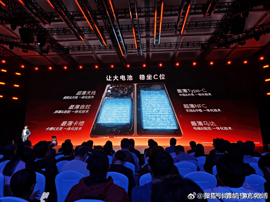 在内部设计方面,为了在极限空间里给电池留下足够空间, 荣耀Magic V6针对内部空间做了系统性考量,对天线、音腔、卡槽、Type-C、NFC、马达等组件进行极致轻薄化处理,让电池稳坐C位。