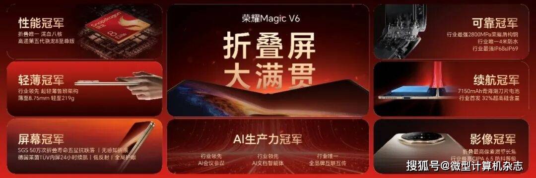 凭借荣耀在折叠屏上的突破性技术创新,荣耀Magic V6实现了屏幕、可靠、轻薄、续航、性能、影像、AI生产力七大维度夺冠,无论硬件实力还是软件体验,均实现全维度拉满,铸就折叠屏全能大满贯。