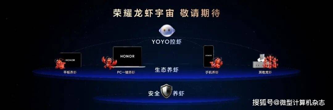 发布会上,还公布了生态级的荣耀龙虾宇宙,支持PC一键养虾、平板养虾,未来还能兼容其他生态设备的龙虾接入。用户可以通过YOYO在荣耀手机上直接和小龙虾交互,并安全地开放手机智能体供小龙虾调用,实现生态养虾、安全养虾和YOYO控虾三大能力。这些功能将于近期陆续开放内测。