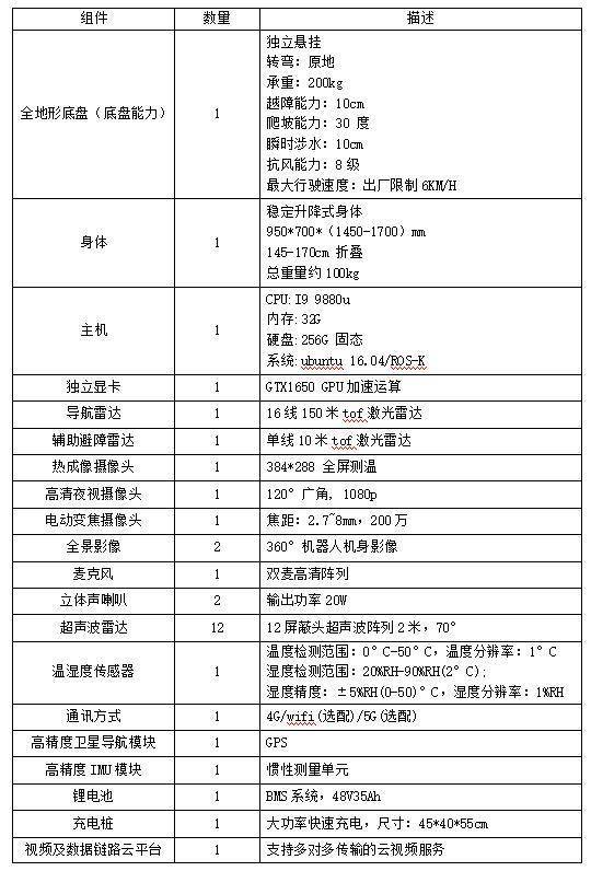 设备配备变焦、广角、热成像三路实时视频传输功能,搭配前部辅助避障雷达,可实现全方位监控与障碍预判避让;采用可折叠式颈部结构,工作高度可在 145cm–170cm 范围内灵活调整,配合全地形通用底盘,支持原地转向、200KG 载重,具备 10cm 越障、跨沟、涉水能力,可攀爬 30° 坡度并抵御 8 级风力,能够根据监控需要调整行进速度与观测高度,适应各类复杂路线。