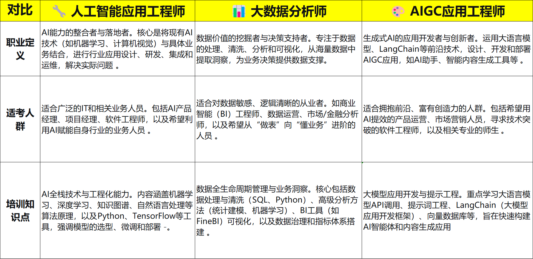 为了帮你做出更合适的选择,泰迪智能科技结合当前最新的行业趋势和岗位要求,从职业定义、适考人群、培训知识点、就职岗位四个维度,为你做一个详细的对比分析。
